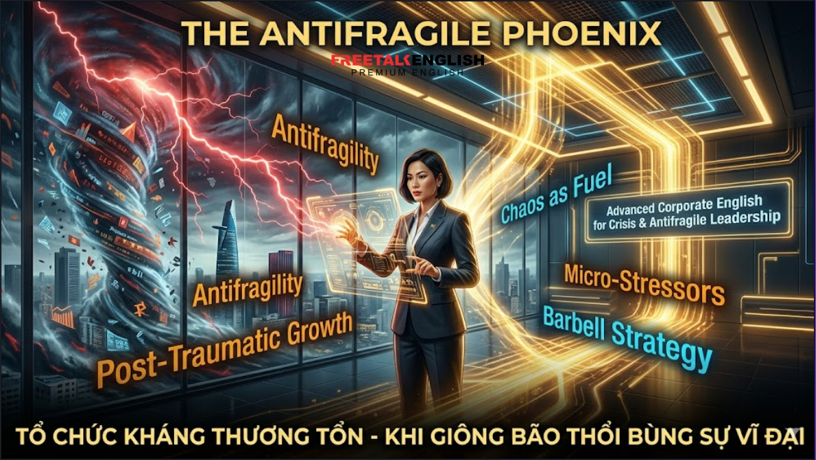 Chỉ có một loại tổ chức duy nhất có thể mỉm cười khi thảm họa xảy ra: Tổ chức Kháng Thương Tổn (Antifragile Organization). HR VP vĩ đại không đi tìm kiếm sự bình yên. Bạn tìm cách thiết kế một bộ gen tổ chức có khả năng “ăn” sự hỗn loạn để lớn lên. Và để đồng bộ hóa tư duy sinh tồn tàn khốc này cho hàng vạn nhân viên xuyên quốc gia, một khóa học tiếng Anh cho doanh nghiệp chuyên biệt về “Crisis Leadership” chính là cỗ máy luyện kim để rèn giũa những chiến binh không bao giờ biết sợ hãi.